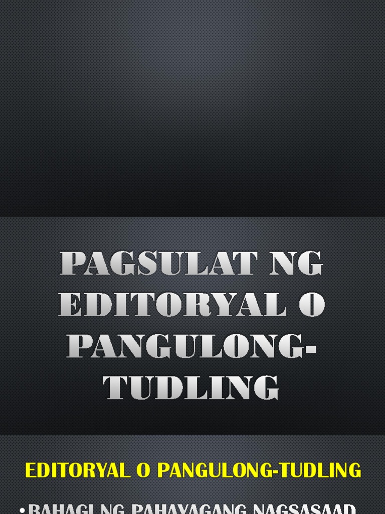 03072014 Ang Editoryal o pangulong-tudling ay isang mapanuring pagpapakahulugan ng kahalagahan ng isang napapanahong pangyayari upang magbigay-kaalaman makapagpaniwala o makalibang sa mga mambabasa. Magbasa ng mga opinyon lalo na ang mga sulat sa patnugotgayundin ang mga artikulo ng mga kilalang kolumnisa. National Schools Press Conference is the highest and the final tilt of journalistic contest from students of both public and private schools across the Philippines.