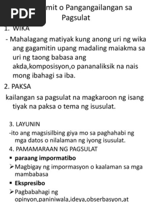Argumentatibo Ang Unang-una kailangang matiyak kung anong wika ang gagamitin sa pagsulat. Narito ang ilan sa mga ito 1. Ginagamit din sa pagsulat ang mata upang imonitor ang anyo ng writing output kahit pa ito ay handwritten lamang o rehistro sa monitor ng kompyuter o print -out na.