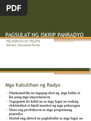 Start studying Pagsulat ng Iskrip ng Programang Panradyo. NG PROGRAMANG PANRADYO ISKRIP Ang taguri sa manuskrito ng isang audio-visual material na ginagamit sa broadcasting. Start studying pagsulat ng iskrip ng programang panradyo.