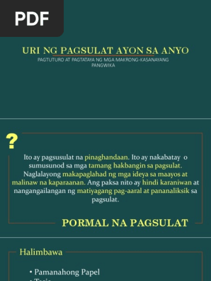 URI NG PAGSULAT AYON SA ANYO _____ PAGTUTURO AT PAGTATAYA NG MGA MAKRONG-KASANAYANG PANGWIKA. 436K people helped. 1 Pagmamasid 2 Pagsulat ng mga naobserbahan Ang pagsulat sa anyong pagsusuri ay hindi lamang isang pag-uulat ng mga naobserbahan kundi isang kasanayan sa pagmamasid.